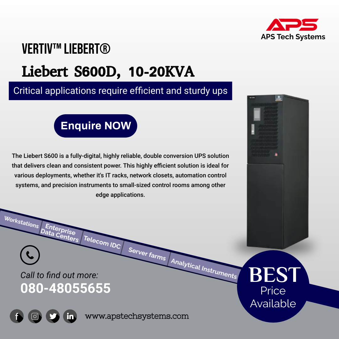 The Liebert S600 D is a double-conversion UPS system designed to provide clean and reliable power to critical IT equipment, ensuring protection against power disturbances, such as surges, sags, spikes, and outages. Double-conversion technology involves constantly converting incoming AC power to DC and then back to AC power, ensuring a consistent output voltage and frequency regardless of the quality of the input power.